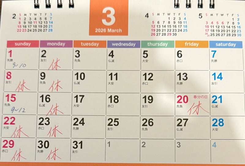 3月の予定です👆🏻3/1(日)は所用の為、10時までの施術となります。